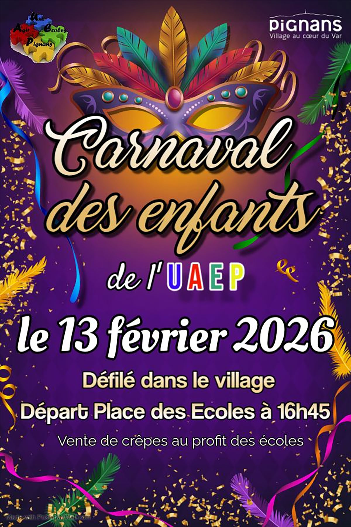 13 fév. – Carnaval des enfants de l’UAEP Publié le 3 janvier 2026 Catégories: agenda, Évenements, UAEP (Unir et Agir pour les Ecoles de Pignans) 13 février 2026 agenda Évenements UAEP (Unir et Agir pour les Ecoles de Pignans)