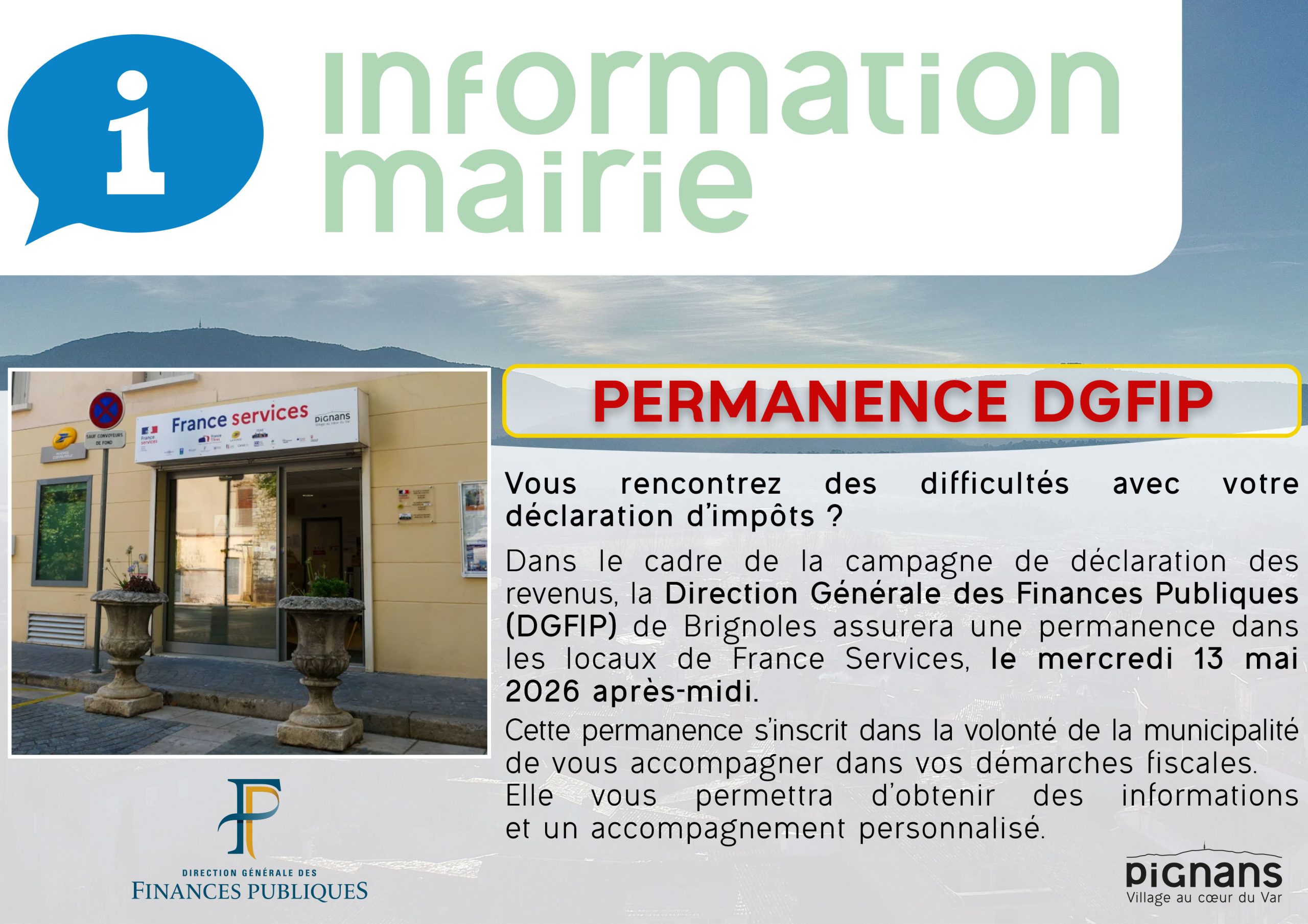 Vous rencontrez des difficultés avec votre déclaration d’impôts ? Dans le cadre de la campagne de déclaration des revenus, la Direction Générale des Finances Publiques (DGFIP) de Brignoles assurera une permanence dans les locaux de France Services, le mercredi 13 mai 2026 après‑midi. Cette permanence s’inscrit dans la volonté de la municipalité de vous accompagner dans vos démarches fiscales. Elle vous permettra d’obtenir des informations et un accompagnement personnalisé.