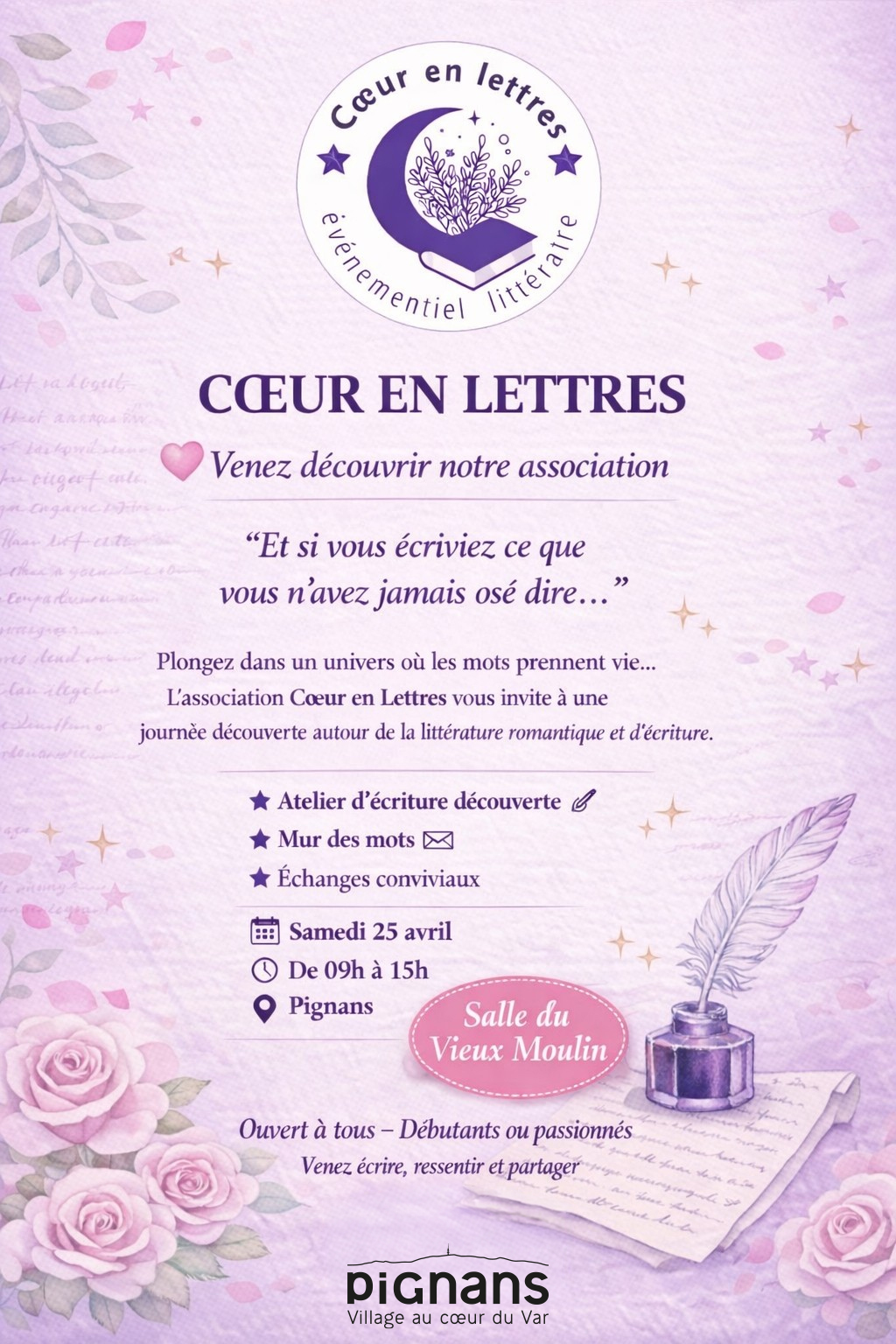 25 avril – Atelier d’écriture découverte – Coeur en lettres Publié le 15 avril 2026 Catégories: agenda, Coeur en lettres, Évenements 25 avril 2026 agenda Coeur en lettres Évenements