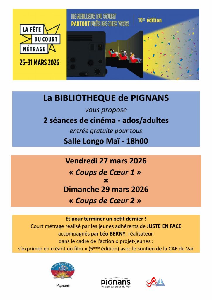 27 et 29 mars – Fête du court métrage Publié le 25 février 2026 Catégories: actualités, agenda, Bibliothèque Municipale, Évenements 27 mars 2026 actualités agenda Bibliothèque Municipale Évenements