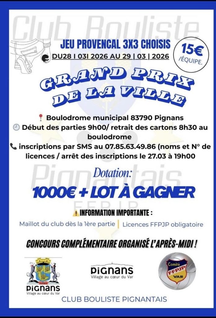 28 et 29 mars – Concours de pétanque – Grand prix de la ville Publié le 25 février 2026 Catégories: agenda, Club Bouliste Pignantais, Évenements de 28 mars 2026 à 29 mars 2026 agenda Club Bouliste Pignantais Évenements