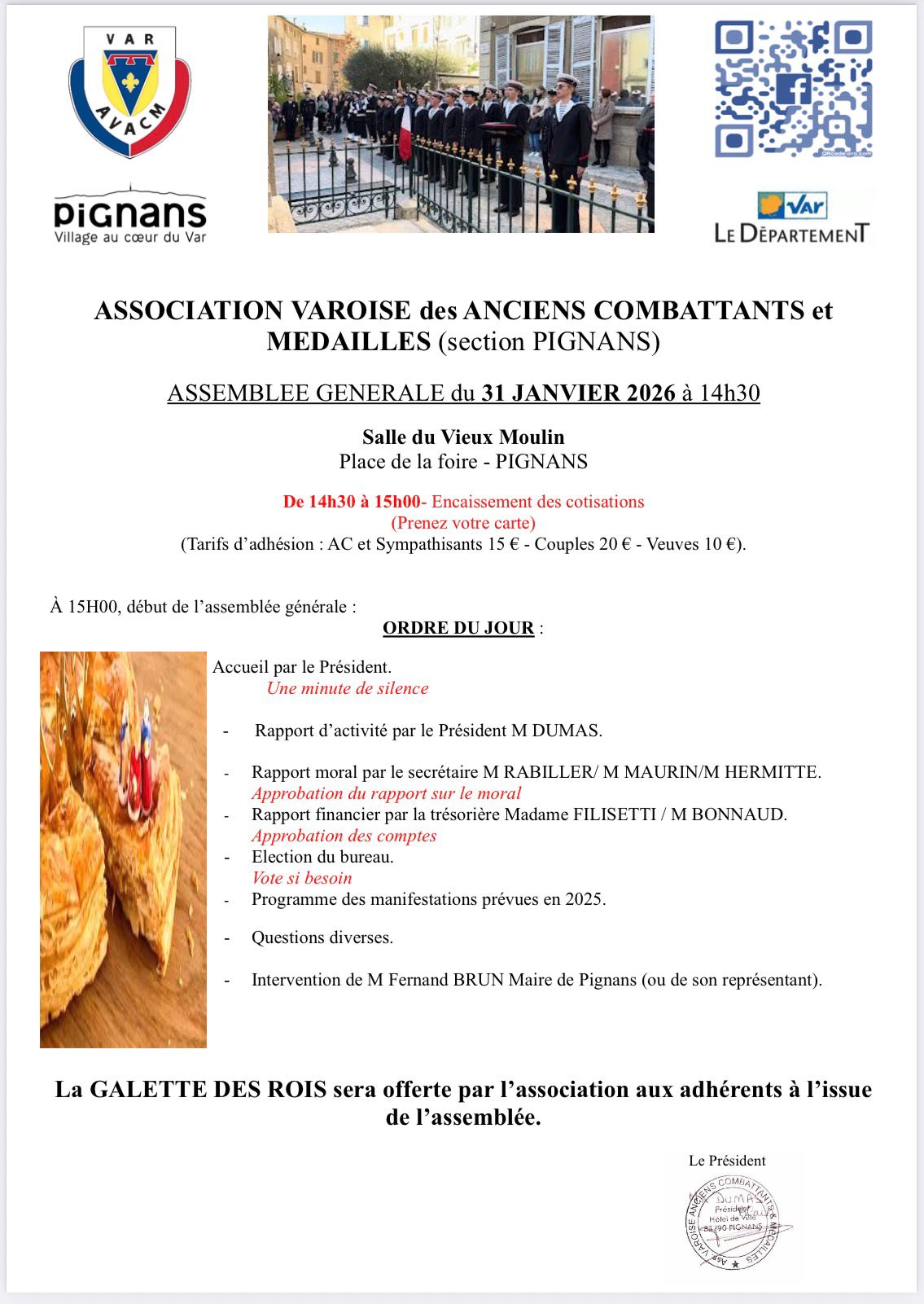 31 jan – Assemblée générale de l’AVACM Publié le 3 janvier 2026 Catégories: A.V.A.C.M. (Association Varoise des anciens combattants et médaillés), agenda, Évenements 31 janvier 2026 A.V.A.C.M. (Association Varoise des anciens combattants et médaillés) agenda Évenements