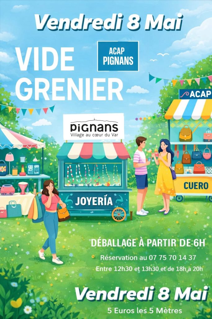 8 mai – Vide grenier Publié le 25 février 2026 Catégories: agenda, Association des Commercants et Artisans de Pignans (A.C.A.P.), Évenements 8 mai 2026 agenda Association des Commercants et Artisans de Pignans (A.C.A.P.) Évenements