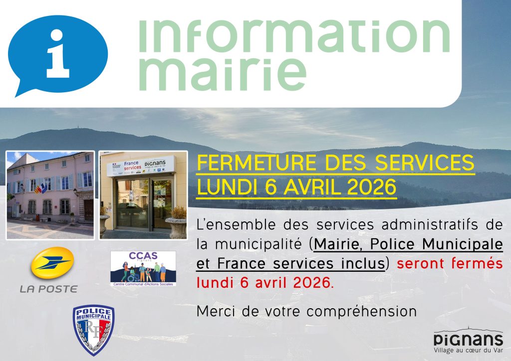 Fermeture des services le 6 avril 2026 Publié le 3 avril 2026 Catégories: actualités, En avant, France Services, La municipalité, Police municipale, Services municipaux L’ensemble des services administratifs de la municipalité (Mairie, Police Municipale et France services inclus) seront fermés lundi 6 avril 2026.Merci de votre compréhension