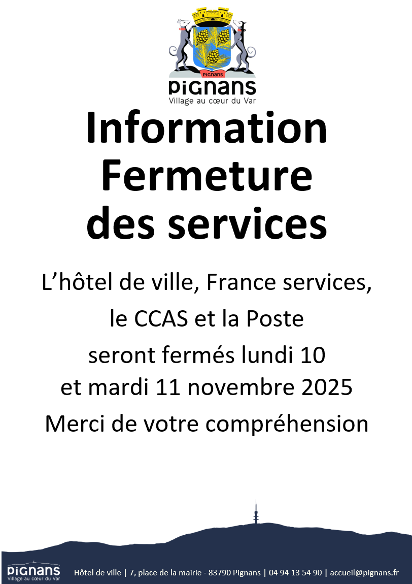 Fermeture des services les 10 et 11 novembre 2025 Publié le 5 novembre 2025 Catégories: Actualité du CCAS, actualités, France Services, La municipalité L’hôtel de ville, France services, le CCAS et la Poste seront fermés lundi 10 et mardi 11 novembre 2025 Merci de votre compréhension