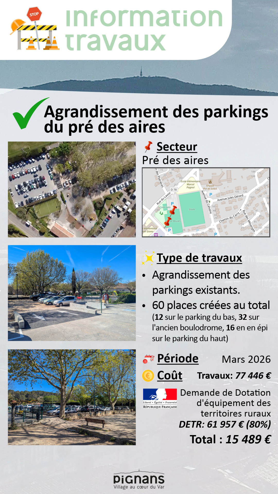 ✨Type de travaux: Agrandissement des parkings existants. 60 places créées au total (12 sur le parking du bas, 32 sur l’ancien boulodrome, 16 en en épi sur le parking du haut)
