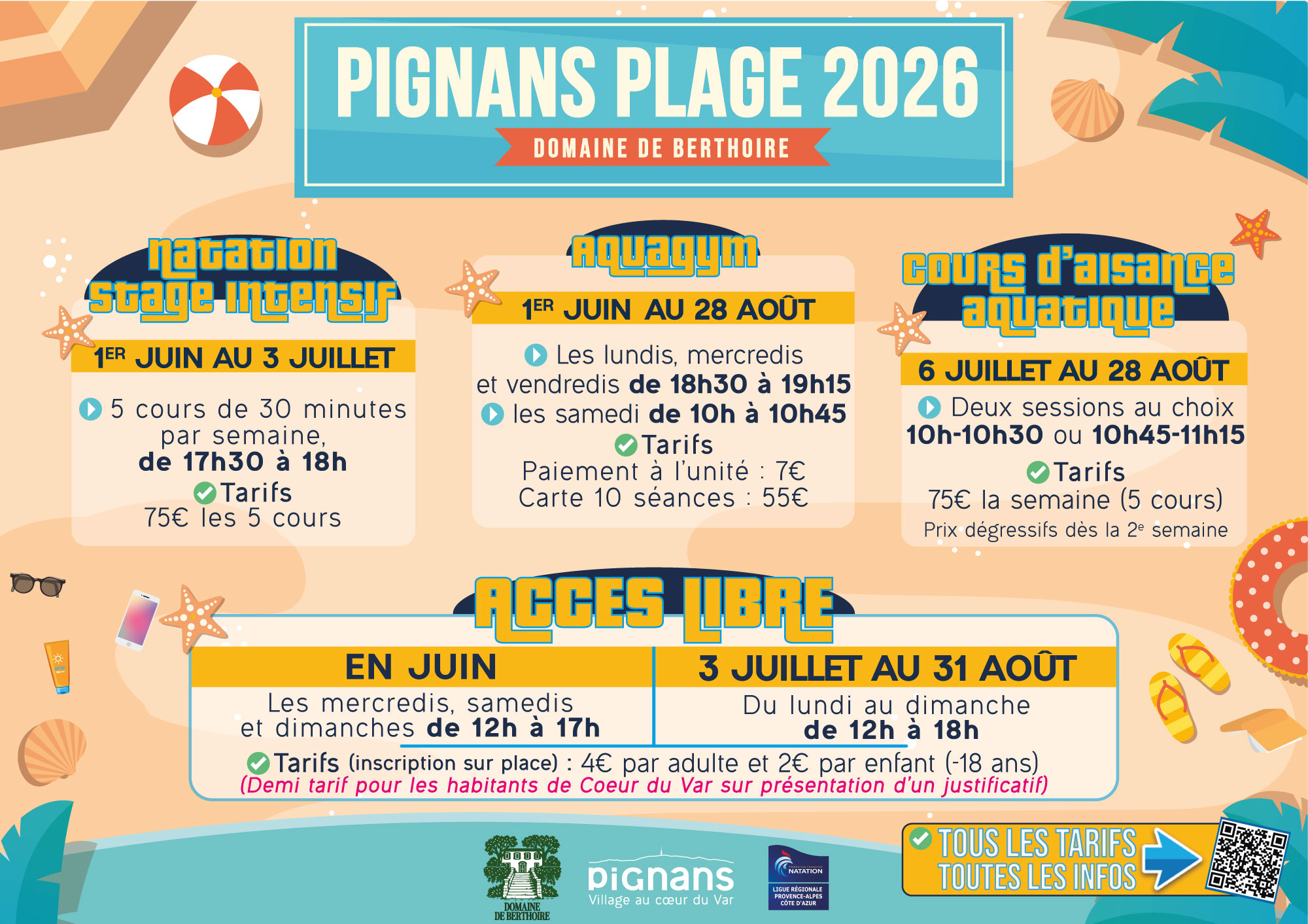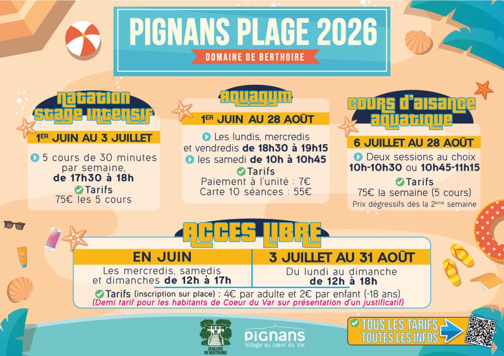 Pour les cours d’aisance aquatique, la natation, et l’aquagym les inscriptions se font à l’accueil de la mairie pour juin, puis directement sur le site de Pignans plage pour juillet et août.