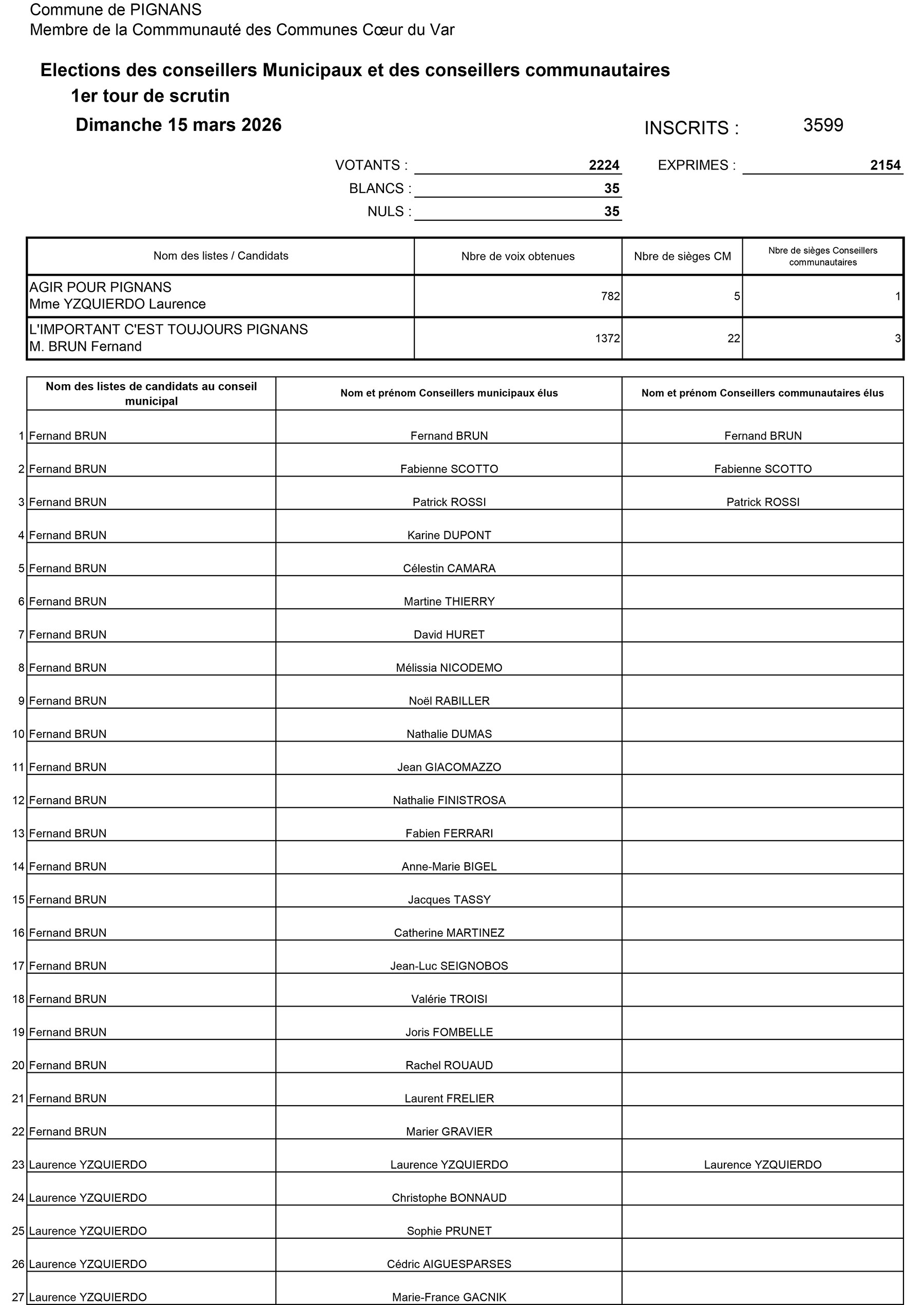 Résultats élections municipales 2026 Publié le 15 mars 2026 Catégories: actualités, En avant, La municipalité L’important c’est toujours Pignans 63.70% 1372 votants Agir pour Pignans 36.30% 782 votants
